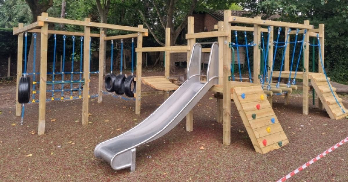 The Valley Road School playground is on its playing field and the equipment, which includes a climbing wall and net, a slide and log bridge, replaces its old set-up which had been in place for more than 20 years.